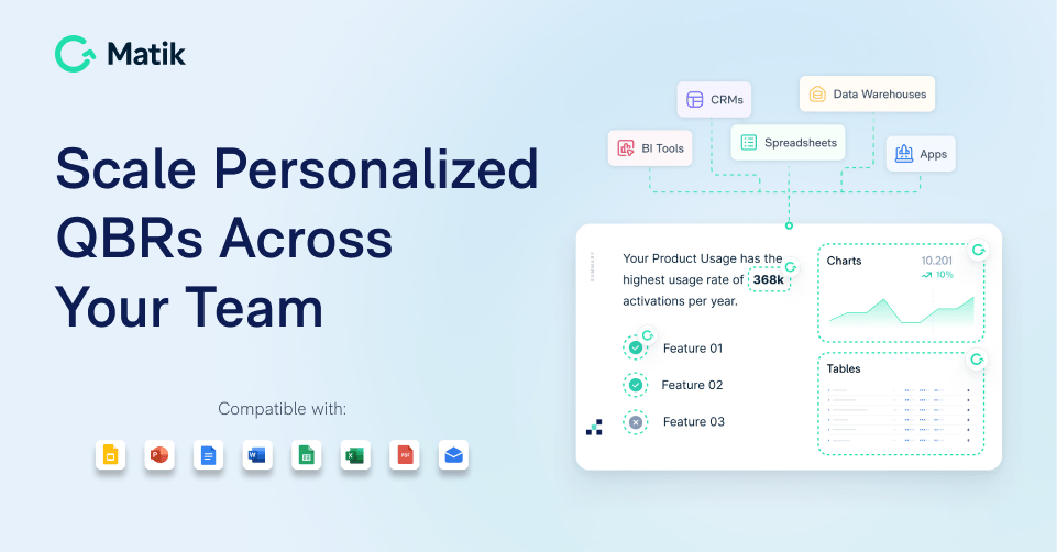 As your account portfolio grows, ensuring every CSM delivers high-quality, personalized QBRs can feel impossible. Matik helps CS leaders standardize and automate QBR creation so every customer gets consistent, data-driven insights.
